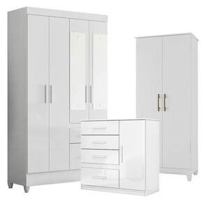 Guarda Roupa com Espelho Infantil Madri com Cômoda Vênus e Armário Multiuso Jade Branco Brilho Moval