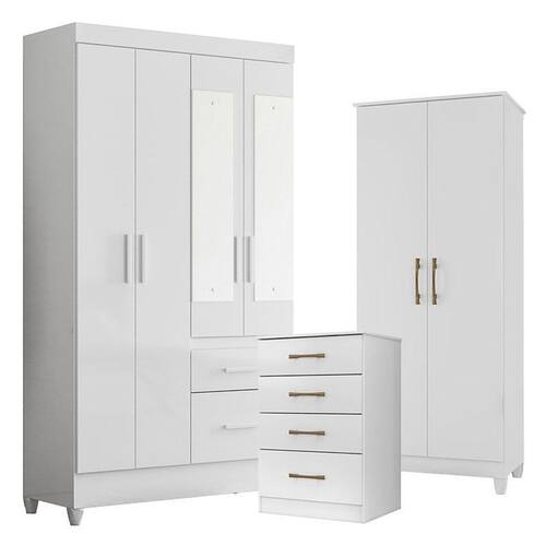 Guarda Roupa com Espelho Infantil Sobral com Cômoda MS913 e Armário Multiuso Jade Branco Brilho Moval