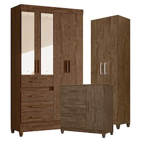Guarda Roupa com Espelho Solteiro Sobral com Cômoda Vênus com pés e Armário Multiuso New Íris Castanho Wood Moval