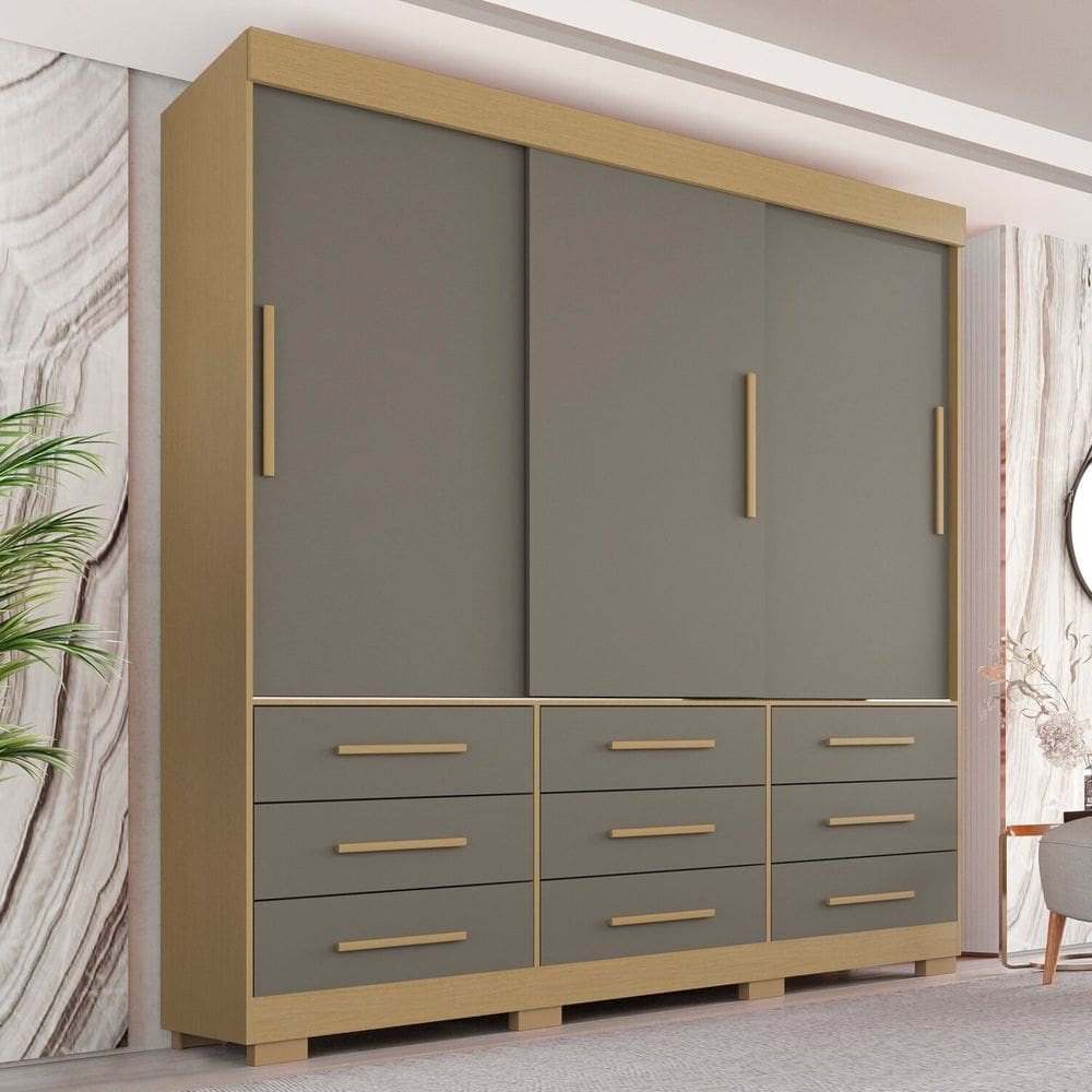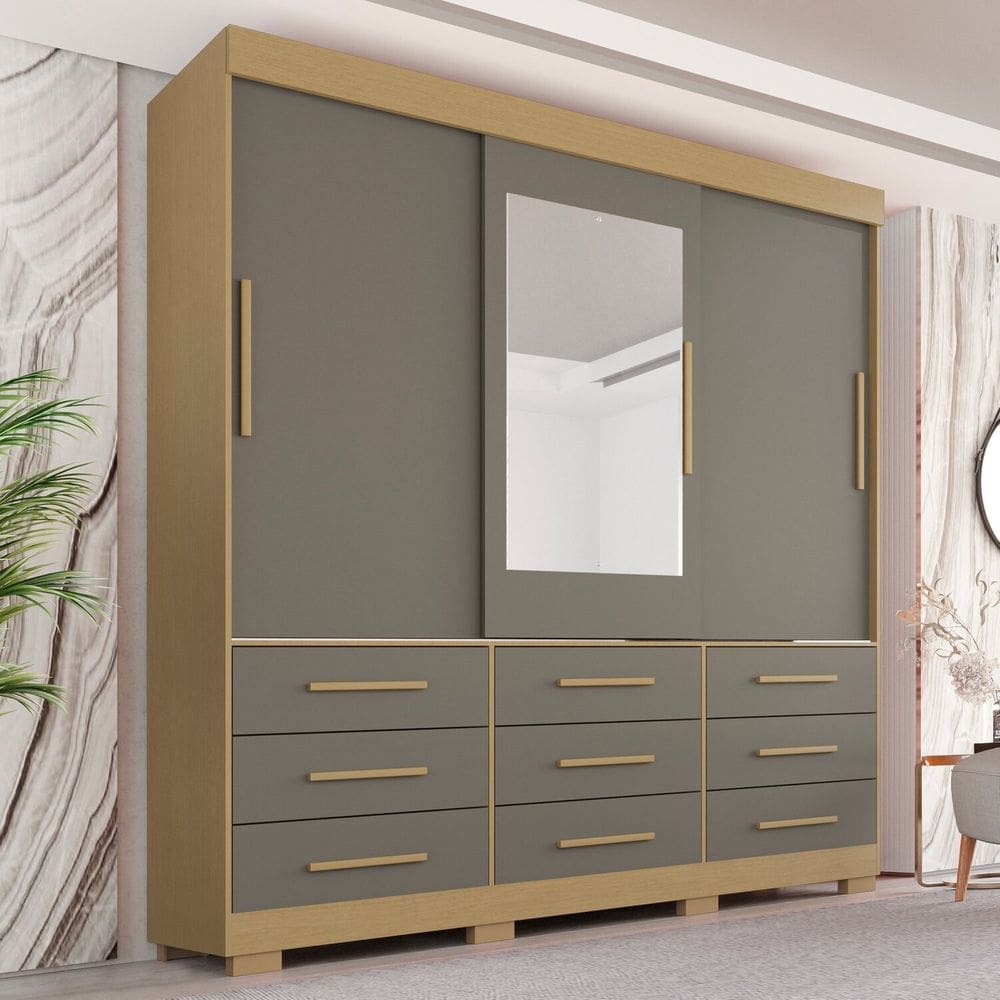 guarda roupa com pes e espelho casal 3 portas 9 gavetas luana