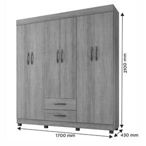 Características:Matéria-prima da estrutura: MDPAmbiente principal: QuartoNecessita montagem: SimPossui pés: Sim, 8.Altura dos pés: 5cmMaterial dos pés: PVCPossui portas: 6Tipo de portas: BaterTipo de puxador da porta: ExternoMatéria-prima dos puxadores: PVCPossui prateleiras: 4Possui gavetas: 2Tipo de gaveta: ExternaTipo de corrediça da gaveta: TelescópicaPossui cabideiro: SimMaterial do cabideiro: AlumínioObservações:Produto necessita de montagem. Não oferecemos serviço de montagem, mas todos os produtos possuem manual de montagem com o passo a passo. Recomendamos contratar um profissional de montagem. Pode existir alguma diferença de tonalidade entre a foto e o produto, devido ao tratamento de imagens e à calibração de cores do monitor. Atenção: Confira as dimensões do produto antes da compra e certifique-se de que estão adequadas aos espaços disponíveis para montagem e uso dos mesmos, aos espaços nos elevadores, escadas, portas e corredores do local da entrega. Pois não são realizadas montagem, desmontagem do produto e/ou portas e janelas, transporte pela escada ou içamento.