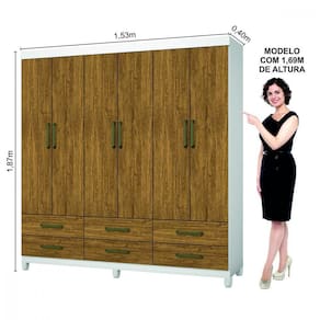 Guarda-Roupa D22 e um produto perfeito para quem possui um ambiente com espaco reduzido e ainda procura qualidade e durabilidade no mesmo moveis. Possui 1,87m de altura, 1,53m de largura e 0,40m de profundidade combinado com 6 portas, 6 gavetas, 3 prateleiras e um grande cabideiro, deixando o produto com uma otima divisao interna. O maleiro e ideal para guardar malas, cobertores, edredons. O cabideiro alem de resistente, e ideal para pendurar pares de blusas, camisas acessorios. As prateleiras sao perfeitas para colocar roupas como blusas, shorts, regatas, kits de maquiagem, toalhas, caixinhas com acessorios e bolsas menores. As gavetas fixadas sobre corredicas metalicas, sao ideais para guardas blusas dobradas, shorts, malhas e roupas intimas. Estrutura do produto em mdp.