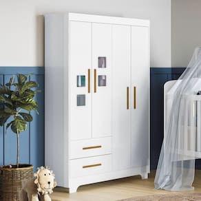 Guarda Roupa de Bebê 100% MDF 4 Portas 2 Gavetas Fly Branco. Quem disse que os melhores perfumes vêm nos menores frascos não poderia estar mais correto. O Guarda-Roupa Fly, além de compacto, é perfeito para qualquer espaço, pois suas gavetas amplas e cabideiro permitem acomodar itens de forma organizada, deixando-os sempre ao alcance. Além disso, seu visual retrô dá um toque de alegria e design ao ambiente, deixando-o muito mais aconchegante. Informações Complementares: Roupeiro com 4 portas, sendo 2 portas com detalhe em acrílico e 2 lisas e 2 gavetas. Possui 1 cabideiro, 1 calceiro, 4 prateleiras. Dobradiças metálicas de pressão. Corrediças metálicas. Acabamento interno também brilhante. Produto com ótima divisão inte Ean: 7908167231585