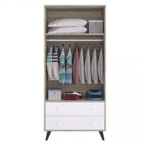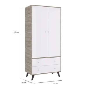 Guarda Roupa de Bebê 2 Portas 2 Gavetas Retrô Móveis Percasa Fresno/Branco. Deixe o quarto do seu bebê ainda mais lindo, o Roupeiro retro possui 2 gavetas com corrediças telescópicas, e 2 portas com dobradiças metálicas, é fabricado em MDP BP carvalho 15 mm (nas laterais e prateleiras), acabamento lacca branco nas frentes de gaveta e portas, seus puxadores são na cor branca, possui cabideiro em alumínio. Possui pés em madeira, fixados com chapa de metal, tornando seu móvel mais resistente. Ean: 7898519567854
