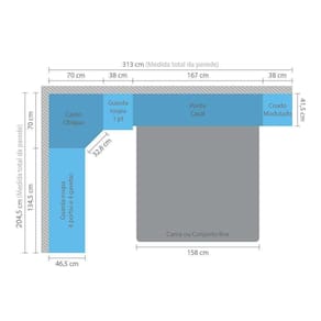 O Dormitório Modulado Master é uma excelente opção para aproveitar o melhor do espaço disponível em seu quarto. O Guarda Roupa de Canto aproveita aquele espaço que parece sem utilidade, com profundidade de 70cm e 3 amplas prateleiras. O armário ponte já vem com cabeceira, indicado para utilização com Colchão Queen de 158cm de largura. Os módulos são peças individuais o que permite montar e acomodar da forma que melhor se adequar ao espaço disponível. Para esta proposta usamos as medidas de parede: Lado Cabeceira 313cm X 199cm.