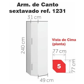 * Imagens meramente ilustrativas. Armário de canto em formato sextavado, dividido em módulo superior e módulo inferior: conta com 3 prateleiras internas na parte superior e amplo espaço na parte inferior. É ideal para composição em L, ocupando 2 paredes não exigindo grau reto. Obs: O canto ocupa um espaço de 7777 cm para cada lado da parede formando um L. - 01 porta grande; - 01 portinha de sapateira; - Maleiro interno; - Puxadores plásticos 256mm cromados. DIMENSÕES DO PRODUTO MONTADO: ALTURA 240 CM LARGURA 77 CM PROFUNDIDADE 77 CM Manual de montagem disponível no site do fabricante. Atenção: Não nos responsabilizamos, no ato da entrega, por desmontagens, subir escadas/elevadores ou transporte por guincho para apartamentos. Eventuais despesas são de responsabilidade do cliente. Confira as dimensões deste produto e certifique-se de que o mesmo passará normalmente por supostos elevadores, portas, escadas e/ou corredores de sua moradia.