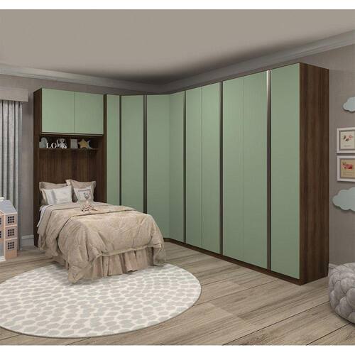 Guarda Roupa de Canto Solteiro 11 Portas 9 Gavetas Nogueira Dourado com Verde Jade Prime Luciane