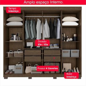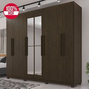 Altura: 226 cm | Largura: 243 cm | Material da Estrutura: 100% MDF | Possui Espelho: Sim | Profundidade: 45 cm | Quantidade de Gavetas: 4 gavetas | Quantidade de Portas: 8 Portas | Tipo de Portas: Bater Cor: Cinamomo/Off