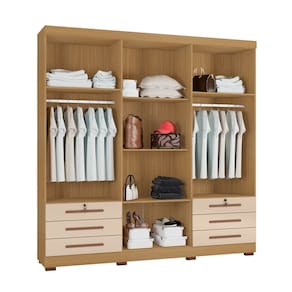 Com 6 gavetas e 6 portas, este guarda-roupas oferece amplo espaço de armazenamento para roupas, acessórios e objetos pessoais. As prateleiras suportam até 5 kg, enquanto as gavetas podem suportar até 3 kg cada. Além disso, ele possui 2 cabideiros em metal e 12 puxadores cromados que complementam seu design moderno.