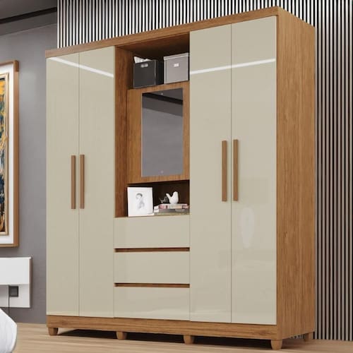 O Guarda Roupas Giga 5 portas possui acabamento em impressão de alta qualidade que garante maior resistência ao móvel, além de um espelho central que vai dar aquele toque de requintado ao seu quarto, gavetas externas com deslize perfeito em corrediça telescópica e pés em PVC de série e prateleiras para melhora acomodar seus pertences. Tudo que seu quarto merece!