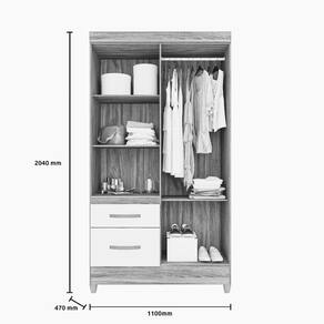 Guarda roupas solteiro Madri 4 portas com 2 gavetas, corrediças metálicas, interna com prateleiras e bastão cabideiro, espaço para acomodar sapatos, pés em PVC, puxadores plásticos na cor bronze, impressão UV.