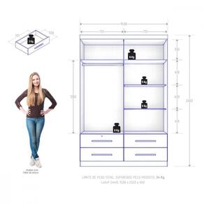 Caracteristicas: - Estrutura em MDF - Com chave em uma gaveta - 4 portas, 4 gavetas e 2 prateleiras - Cabideiros metalicos - Dobradicas metalicas - Corredicas telescopicas - Puxadores em MDF - Acabamento de Pintura: Semi fosco - Suporte de peso das gavetas: 3kg - Suporte de peso das prateleiras: 5kg - Garantia de 3 meses
