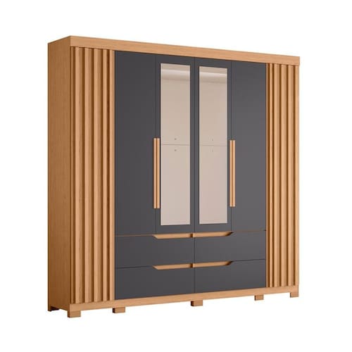 Produto: Guarda Roupa Doble Casal com Espelho Cor: Freijó/Titanium Portas Laterais Com Acabamento Ripado, 04 Gavetas Com Puxadores Cava E Corrediças Telescópicas, Puxadores De Mdf Revestidos, Cabideiros Em Alumínio, Pés Inclusos. Escala de Brilho: Fosco Altura (m): 2,3 Largura (m): 2,4 Profundidade (m): 0,47 Peso (kg): 162,5 Material: MDP Acabamento: Pintura Uv Material do Puxador: Mdf Revestidos Tipo de Cabideiro: Alumínio Quantidade de Gavetas: 4 - Tipo de Corrediça: Telescópicas Quantidade de Portas: 6 - Tipo de Porta: Bater Quantidade de Prateleiras: 10 Rodízios: Não Quantidade de Pés: 10 - Material dos Pés: ABS Necessita Montagem: SIM Espelho: Kit 4 Espelhos Parafusados Na Porta 0,70 X 0,30 M (Cada) Manutenção: Limpar Com Flanela Ou Pano Macio Seco, Não Utilizar Produtos Abrasivos, Desengordurantes, Álcool Ou Solvente. Não Expor O Produto Diretamente À Luz Solar E À Umidade. Garantia: 3 Meses