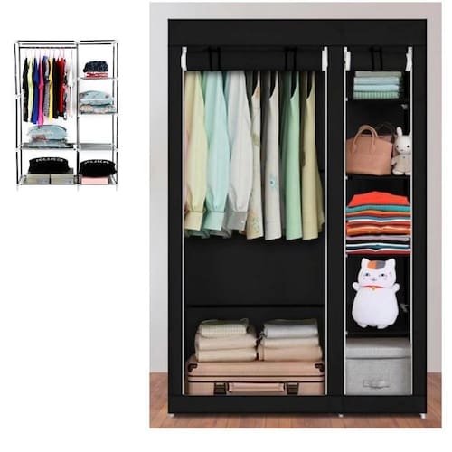 Guarda Roupa Duplo Portatil Cabideiro Arara Roupas 5 Prateleiras Armario Dobravel Organizador Preto Guarda roupa dobrável armário cabideiro portátil arara multifuncional para camping e organização na praia este guarda-roupa dobrável é uma solução elegante e prática para espaços compactos, oferecendo amplo espaço para pendurar roupas e uma grande seção com prateleiras para organização adicional. As tampas de enrolar ajudam a manter a poeira afastada, enquanto o design dobrável facilita o transporte e a montagem. Características:design elegante: ideal para espaços compactos, oferece espaço para pendurar roupas e prateleiras para organizar diversos itens.Proteção contra poeira e sujeira: as tampas de enrolar mantêm a poeira afastada, garantindo que suas roupas permaneçam limpas e organizadas.Grande capacidade: com duas capas de enrolar, uma barra de suspensão e 5 prateleiras, oferece amplo espaço para armazenar ternos, vestidos, jaquetas e camisas, além de outros itens essenciais. Fácil de instalar: a montagem é simples e rápida, tornando-o pronto para uso em pouco tempo.Medidas: 105cm de largura, 45cm de profundidade e 175cm de altura.Este guarda-roupa dobrável é uma escolha prática e versátil para quem busca manter suas roupas e itens pessoais organizados, seja em casa, no camping ou na praia. Com sua capacidade de armazenamento e facilidade de instalação, é uma opção conveniente para diversas situações.