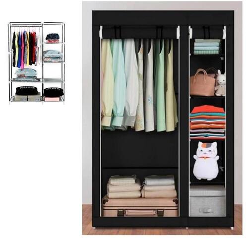 Guarda Roupa Duplo Portatil Cabideiro Arara Roupas 5 Prateleiras Armario Dobravel Organizador Preto Guarda roupa dobrável armário cabideiro portátil arara multifuncional para camping e organização na praia este guarda-roupa dobrável é uma solução elegante e prática para espaços compactos, oferecendo amplo espaço para pendurar roupas e uma grande seção com prateleiras para organização adicional. As tampas de enrolar ajudam a manter a poeira afastada, enquanto o design dobrável facilita o transporte e a montagem. Características:design elegante: ideal para espaços compactos, oferece espaço para pendurar roupas e prateleiras para organizar diversos itens.Proteção contra poeira e sujeira: as tampas de enrolar mantêm a poeira afastada, garantindo que suas roupas permaneçam limpas e organizadas.Grande capacidade: com duas capas de enrolar, uma barra de suspensão e 5 prateleiras, oferece amplo espaço para armazenar ternos, vestidos, jaquetas e camisas, além de outros itens essenciais. Fácil de instalar: a montagem é simples e rápida, tornando-o pronto para uso em pouco tempo.Medidas: 105cm de largura, 45cm de profundidade e 175cm de altura.Este guarda-roupa dobrável é uma escolha prática e versátil para quem busca manter suas roupas e itens pessoais organizados, seja em casa, no camping ou na praia. Com sua capacidade de armazenamento e facilidade de instalação, é uma opção conveniente para diversas situações.