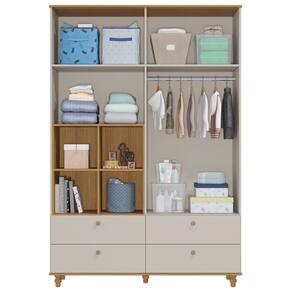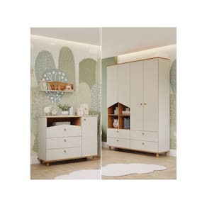 Seguindo o estilo lúdico, esse roupeiro é perfeito para quem deseja um móvel para organizar e, também, decorar. O detalhe fica por conta dos nichos laterais e as portas em formato casinha. Os puxadores e pés são torneados em madeira maciça e conferem um charme especial ao produto. Possui 4 gavetas grandes com corrediças telescópicas que proporcionam deslizamento suave, maior abertura e melhor acesso às roupas. Os nichos laterais podem ser utilizados para objetos decorativos, cestos para organização de brinquedos, livros e etc. Os espaços internos de prateleiras e maleiros são ideais para guardar desde objetos menores até objetos maiores como malas, pacotes de fraldas e caixas ou cestos de organização. Fabricado com matéria-prima 100% MDF, um material ecologicamente correto e de ótima durabilidade e resistência, esse roupeiro é excelente para quem precisa de bastante espaço para organizar tudo com muito carinho. O acabamento de pintura é feito com tinta e verniz UV atóxicos.