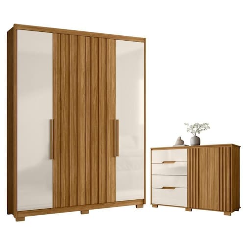 A Cômoda contém porta com acabamento ripado, possui quatro gavetas com espaço amplo excelente para organizar toda suas roupas, prateleira interna para acomodar seus sapatos, caixas