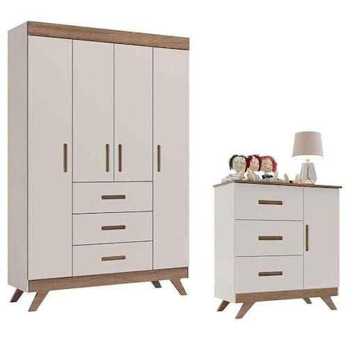 Guarda Roupa e Cômoda Infantil Retrô Maya Off White Carvalho Carolina