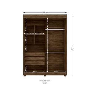 Dimensões (AxLxP): Altura: 233 cm Largura: 163 cm Profundidade: 60 cm MATERIAL:- Estrutura em MDP 15 mm- Porta em MDF 9 mm- Molduras em MDF 25 mm- Frente e Lateral da Gaveta em MDP 15 mm- Pés Fixos em Madeira- Trilhos Metálicos- Corrediças Telescópicas nas gavetas- Puxador em MDF- Cabideiro de Metal- Acabamento FoscoSobre preços e ofertas:- Fica garantida a empresa a eventual retificação das ofertas e erros de digitação que possam ter sido veiculados, podendo ser estornado a compra;Sobre as imagens ilustrativas:- As imagens ambientadas são meramente ilustrativas e podem apresentar itens que não compõe o produto;- Objetos decorativos que aparecem na foto não acompanham o produto;- As cores do produto podem variar de acordo com o monitor, a iluminação do ambiente ou sua percepção visual;- Atenção: pequenos detalhes e acabamentos, que não ficam evidentes na foto, estão detalhados na descrição dos móveis;Sobre a entrega e montagem:- Os móveis são entregues desmontados e com manual de montagem;- Verifique a complexidade antes de decidir montar sozinho ou contrate um profissional de sua confiança;- Montagem, desmontagens, e instalações devem ser contratadas pelo cliente;- Confira as dimensões antes da compra, e certifique-se de que o produto passará por elevadores, portas e corredores;Sobre a garantia:- Garantia de até 90 dias após o recebimento do produto;- Todas as garantias são dadas pelos fabricantes e variam de produto para produto;- O prazo de garantia será informado nas páginas de cada produto. Caso tenha alguma dúvida, entre em contato conosco;- Para devoluções, os produtos deverão ser remetidos em suas embalagens originais e caso for constatado mal uso, o custo de transporte será por parte do consumidor;ATENÇÃO: nossa entrega não inclui a subida de lances de escada ou o içamento de produtos.