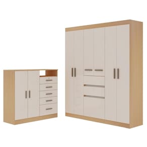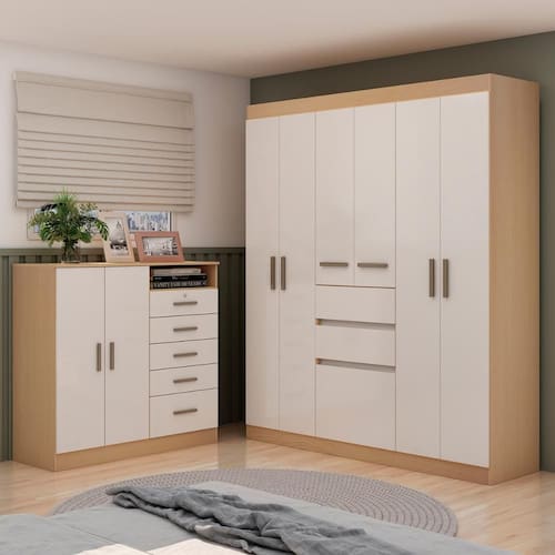 Imagina ter um quarto muito mais bonito, organizado e prático com um kit que une dois móveis superfuncionais! O Guarda-Roupa Genialflex Berna + Cômoda é a escolha perfeita pra quem busca estilo e espaço. As caixas no padrão Freijó dão aquele toque aconchegante da madeira, enquanto as portas no Branco Laca Brilho trazem modernidade e luminosidade pro ambiente. Com várias portas e gavetas espaçosas, fica fácil manter roupas, acessórios e objetos sempre em ordem. Além disso, a combinação do guarda-roupa com a cômoda deixa tudo mais prático e harmonioso, transformando seu quarto em um espaço cheio de charme e funcionalidade!