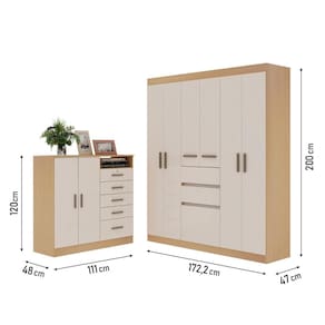 ESPECIFICAÇÕES DO GUARDA-ROUPA - Estrutura da caixa em MDP 12 mm padrão Freijó - Portas e frentes de gavetas em MDP 15 mm branco brilho Laca - Puxador polímero de cor champanhe - Acabamento com pintura UV - Dobradiças e corrediças metálicas - 3 cabideiros de madeira maciça - Costas 3 mm - Rodapé MDP 15 mm padrão Freijó
