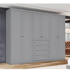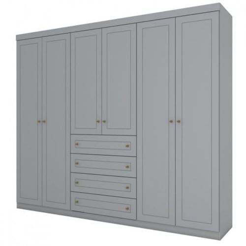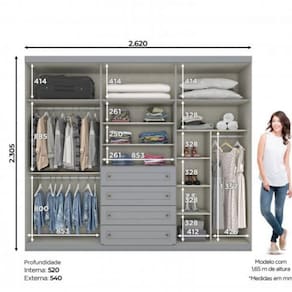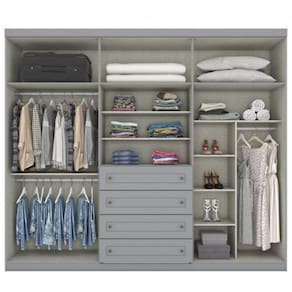 Conforto, sofisticacao e praticidade sao pontos fortes deste roupeiro. Prateleiras que oferecem organizacao as roupas e aos pequenos objetos do casal. Cabideiros e calceiro em aluminio.