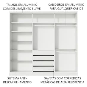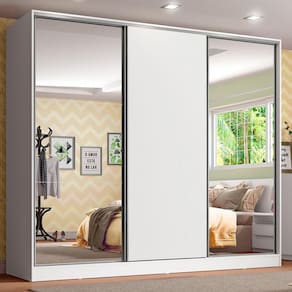 Itens inclusos: - Três (3) cabideiros - Quatro (4) gavetas internas - Oito (8) prateleiras - Três (3) portas de correr, com sistema anti-descarrilhamento, sendo uma (1) de madeira e duas (2) com espelhos