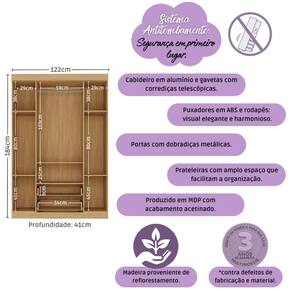 Diferenciais: - 3 anos de garantia contra defeitos de fabricação e material. - Produzido em madeira de reflorestamento (MDP 12/15mm) com acabamento acetinado (cerca de 20% de brilho): sustentabilidade e durabilidade. - 4 portas e 2 gavetas: amplo espaço interno para organizar roupinhas e acessórios. - Corrediças telescópicas: permitem a abertura total e o manuseio silencioso das gavetas. - Cabideiro em alumínio: acomoda roupas longas e curtas para que não amassem. - Puxadores em ABS redondos e práticos. - Rodapé: visual harmonioso e facilidade na limpeza do ambiente. - Sistema antitombamento: proporciona segurança para o filho e tranquilidade aos pais.