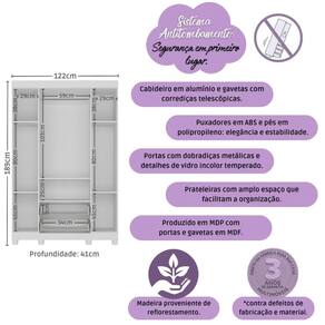 Diferenciais: - 3 anos de garantia contra defeitos de fabricação e material. - Produzido em madeira de reflorestamento (MDP 12/15mm) com acabamento acetinado (cerca de 20% de brilho): sustentabilidade e durabilidade. - 4 portas e 2 gavetas (frontais em MDF): amplo espaço interno para organizar roupinhas e acessórios. - Detalhes de vidro incolor temperado 3mm: toque charmoso que permite visualizar o interior do móvel. - Corrediças telescópicas: permitem a abertura total e o manuseio silencioso das gavetas. - Cabideiro em alumínio: acomoda roupas longas e curtas para que não amassem. - Puxadores em ABS redondos e práticos. - Pés em polipropileno e rodapé: estabilidade e elegância. - Sistema antitombamento: proporciona segurança para o filho e tranquilidade aos pais.