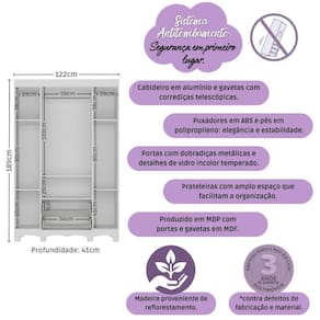 Dimensões do Produto Montado: Altura: 189cm | Largura: 122cm | Profundidade: 41cm *Você pode consultar as medidas detalhadas na imagem técnica do produto.