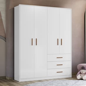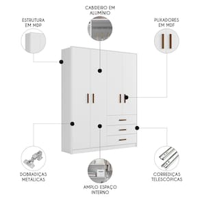 Características do Produto Material da Estrutura: 100% MDP. Espessura das Chapas: 12mm/15mm. Peso Suportado: 63kg distribuídos. Acabamento: Pintura UV. Escala de Brilho: Brilho/Fosco. Quantidade de Portas: 4 Por tas. Material da Dobradiça: Metálicas. Tipo de Porta: Convencional. Possui Cabideiros: Sim. Quantidade Cabideiros: 1 cabideiro. Material Cabideiro: Alumínio. Possui Gaveta: Sim. Quantidade de Gavetas: 3 Gavetas. Tipo de Corrediças: Telescópicas. Material do Puxador: MDF. Possui Prateleiras: Sim. Quantidade de Prateleiras: 6 Prateleiras. Possui Pés: Não. Possui Espelho: Não. Diferenciais: - Design moderno. - Gavetas com corrediças telescópicas. - Puxador em MDF. Sistema de Montagem: Cavilha/Parafuso/Minifix. Manual de Montagem: Sim. Complexidade da Montagem: Média. Volumes: 3 Volumes. Conteúdo da embalagem: 1 Guarda Roupa. Garantia do Fabricante: 90 dias contra defeito de fabricação. Montagem: Recomendamos que seja feita por um profissional. Recomendação de Limpeza: Utilize pano levemente úmido.