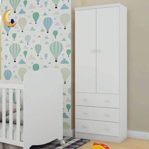 Guarda Roupa Infantil 2 Portas e 3 Gavetas 100% MDF Smim Branco Brilho. O Guarda Roupa Infantil Smim foi projetado para que mesmo em um pequeno espaço conseguir organizar todas as roupinhas do seu bebê. Contém 2 portas e 3 gavetas espaçosas com corrediças metálicas telescópicas que auxiliam no deslize suave e silencioso, puxadores em plástico e cabideiro metálico. Produzido em 100% MDF e acabamento em pintura UV atóxica, garante a melhor qualidade e segurança para toda família. Ean: 7908167250746
