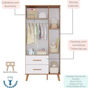 O Guarda-Roupa Pé Palito une estilo retrô e praticidade para compor um ambiente elegante e funcional. Com design charmoso e pés palito em madeira maciça, é perfeito para quartos de bebê, infantil ou até para uso adulto, oferecendo espaço interno bem distribuído para manter roupas e acessórios sempre organizados. Produzido em MDF de alta resistência, conta com acabamento em pintura atóxica, garantindo durabilidade e segurança.