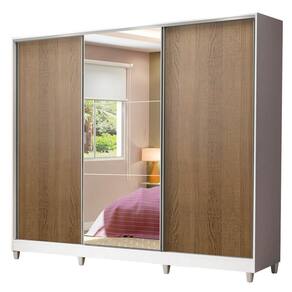 O fechamento é com três portas de correr, sendo duas de madeira e uma com espelhos, que ampliam o ambiente e dão um ganho de espaço enorme, sem comprometer a circulação no quarto.