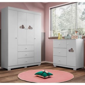 O Guarda Roupa Infantil é um dos móveis mais importantes do quarto de bebê, afinal ele será utilizado para guardar muitas coisas como roupinhas, sapatinhos, fraldas, lenços, toalhas e demais objetos. Pensando na otimização da sua rotina, apresentamos o Guarda Roupa Amora com design atemporal e clean, torna o ambiente apaixonante! O detalhe nas portas em acrílico no formato de nuvem, são um charme a parte. Este roupeiro conta com 4 portas, 3 gavetas com corrediças telescópicas, cabideiro metálico e amplo espaço interno.