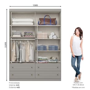 FICHA TECNICA: Acabamento: Pintura UV Texturizada Escala de Brilho: Fosco Material Principal: MDP/MDF Qtd. Gavetas: 4 Und Peso Maximo por Gaveta: Cada Gaveta suporta ate 3 Kg, a carga deve ser distribuida uniformemente Material do Puxador Gaveta: ABS Material da porta: MDF Material da Corredica: Corredica Telescopica Material da Gaveta: MDP/MDF Qtd. Portas: 4 Und Material da Dobradica: Metalica Material do Puxador Porta: ABS Tipo Porta: Bater Qtd. Prateleiras: 5 Und Peso Maximo por Prateleira: Cada Prateleira suporta ate 8 Kg, a carga deve ser distribuida uniformemente Material da Prateleira: MDP Produto Suporte ate -Kg-: 62 Kg Possui Vidro: Nao Possui Espelho: Nao Possui Iluminacao: Nao Possui Ganchos: Nao Medidas Montado: -A x L x P- 220,5 x 158,5 x 46,5 Cm Peso Montado: 113 Kg
