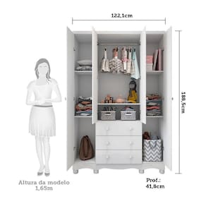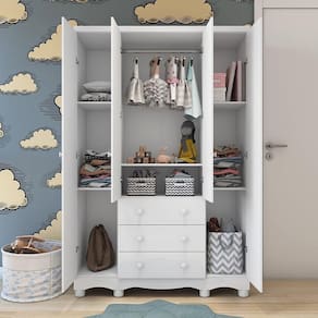 Guarda Roupa Infantil 4 Portas e 3 Gavetas 100% MDF Mimo Branco Brilho. O Guarda Roupa Mimo foi desenvolvido para oferecer qualidade, beleza, conforto e segurança para toda família na hora de montar o quartinho do(a) bebê. É produzido com estrutura 100% MDF e acabamento em pintura UV atóxica. Possui 4 portas, 3 gavetas que deslizam sob corrediças metálicas telecópicas, 1 cabideiro metálico, 5 prateleiras para acomodar as peças com organização da sua preferência, puxadores e pés em plástico. Acompanham o produto, 2 opções de rodapés, um usinado (torneado) e outro reto, para que você escolha no momento da montagem qual se adequa ao estilo do ambiente. Aproveite para adquirir o seu agora! Ean: 7898593963504