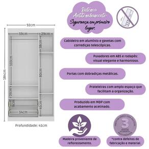 Dimensões do Produto Montado: Altura: 184cm | Largura: 92cm | Profundidade: 41cm *Você pode consultar as medidas detalhadas na imagem técnica do produto.