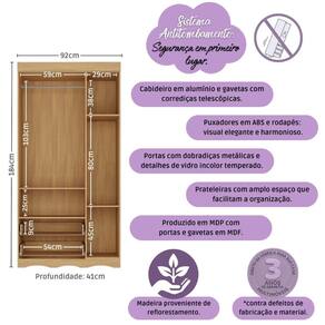 Diferenciais: - 3 anos de garantia contra defeitos de fabricação e material. - Produzido em madeira de reflorestamento (MDP 12/15mm) com acabamento acetinado (cerca de 20% de brilho): sustentabilidade e durabilidade. - 3 portas e 2 gavetas (frontais em MDF): amplo espaço interno para organizar roupinhas e acessórios. - Detalhes de vidro incolor temperado 3mm: toque charmoso que permite visualizar o interior do móvel. - Corrediças telescópicas: permitem a abertura total e o manuseio silencioso das gavetas. - Cabideiro em alumínio: acomoda roupas longas e curtas para que não amassem. - Puxadores em ABS redondos e práticos. - Rodapé usinado em MDF: visual elegante. - Sistema antitombamento: proporciona segurança para o filho e tranquilidade aos pais.