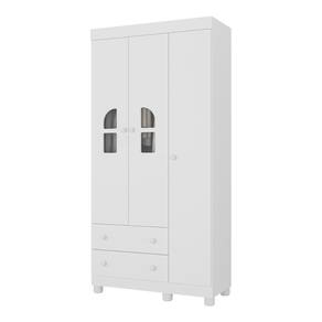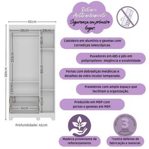 Diferenciais: - 3 anos de garantia contra defeitos de fabricação e material. - Produzido em madeira de reflorestamento (MDP 12/15mm) com acabamento acetinado (cerca de 20% de brilho): sustentabilidade e durabilidade. - 3 portas e 2 gavetas (frontais em MDF): amplo espaço interno para organizar roupinhas e acessórios. - Detalhes de vidro incolor temperado 3mm: toque charmoso que permite visualizar o interior do móvel. - Corrediças telescópicas: permitem a abertura total e o manuseio silencioso das gavetas. - Cabideiro em alumínio: acomoda roupas longas e curtas para que não amassem. - Puxadores em ABS redondos e práticos. - Pés em polipropileno e rodapé: estabilidade e visual elegante. - Sistema antitombamento: proporciona segurança para o filho e tranquilidade aos pais.