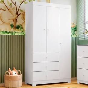 Com um design encantador, e com sua estrutura em 100% MDF e com acabamento em pintura UV, realçando a e durabilidade do móvel. Os puxadores e pés de PVC adicionam um toque especial. Oferece um cabideiro de alumínio e 1 Prateleira com ótimo espaço interno que permite uma organização eficiente ao ambiente infantil, o Guarda Roupa 3 Portas e 3 Gavetas conta com corrediças telescópicas e dobradiças metálicas que garantem durabilidade do móvel, é mais que um Roupeiro, é a solução para organização do ambiente infantil.