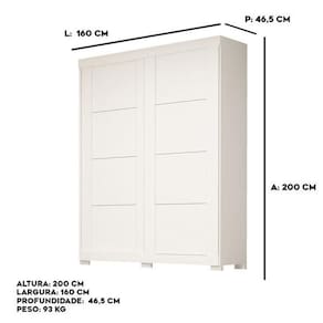 Materiais da estrutura: MDF | Cor: Branco | Tipo de produto: Guarda-Roupa | Quantidade de Prateleiras: 5 | Quantidade de Portas: 2 | Material dos Cabideiros: Alumínio | Possui Portas: Sim | Altura: 200 cm | Sistema de montagem: Convencional (Parafusos, minifix e cavilhas) | Possui Puxadores: Sim | Tipo de Garantia: Garantia do Fabricante | Peso: 98,5 Kg | Tipo de Corrediças: Telescópicas | Peso Suportado por Prateleira: 5 Kg | Peso Suportado por Gaveta: 5 Kg | Largura: 160 Cm | Quantidade de Gavetas: 2 | Peso Suportado: 75 Kg (distribuídos de forma adequada no mesmo) | Possui Espelho: Não | Necessita de Montagem: Sim | Garantia: 03 meses | Possui Prateleiras: Sim | Possui Gavetas: Sim | Profundidade: 46,5 cm | Possui Cabideiro: Sim | Marca: Linhamobilia | Requer montagem: Sim | Inclui manual de montagem: Sim Cor: Branco