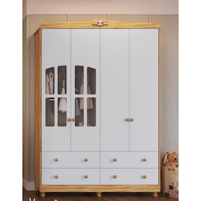 Conteúdo da Embalagem: - 1 Guarda Roupa Infantil Peroba Elô 4 Portas e 4 Gavetas - Branco/Carvalho - Kit Ferragem e Esquema de Montagem