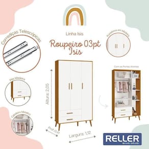 Guarda Roupa Infantil Isis 3 Portas E 2 Gavetas Branco/savana - Reller Móveis Branco/savana Guarda Roupa Infantil Isis 3 Portas e 2 Gavetas - Reller Móveis O Guarda Roupa Isis 3 Portas e 2 Gavetas além de muito estiloso, oferece amplo espaço para organizar os pertences do seu bebê. Possui 3 Portas e 2 Gavetas com puxadores em madeira e seus pés estilo retrô traz elegância aliada ao conforto. ESPECIFICAÇÕES: - Estrutura 100% MDF - Pintura UV atóxica - Acabamento fosco - 3 Portas - Dobradiças metálicas - 2 Gavetas - Corrediças telescópicas - Cabideiro metálico - Prateleiras - Puxadores em madeira - Pés estilo retrô em madeira - Amplo espaço interno
