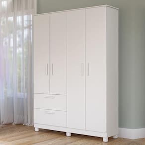 Guarda Roupa Infantil Jujuba 4 Portas e 2 Gavetas - Permóbili Baby O Guarda Roupa Infantil Jujuba 4 Portas é o sonho de qualquer criança e dos pais que buscam qualidade e praticidade. Sua estrutura em MDF com pintura UV garante resistência e um visual encantador para o quarto dos pequenos. Com quatro portas e duas gavetas, oferece amplo espaço para organizar roupas, brinquedos e acessórios. As dobradiças metálicas e corrediças telescópicas garantem durabilidade e suavidade no abrir e fechar. Além disso, possui cabideiro, prateleiras internas e puxadores em ABS, detalhes que agregam funcionalidade e charme ao móvel. Com capacidade para até 3kg em cada gaveta, é a escolha ideal para completar o quarto dos pequenos com conforto e elegância.