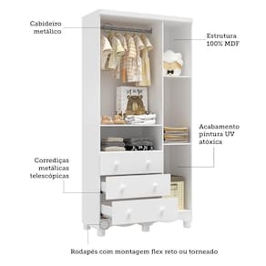 O Guarda-Roupa Infantil Júnior 3 Portas e 3 Gavetas é uma excelente escolha para quem busca organização e praticidade no quarto das crianças. Fabricado em MDF com pintura UV atóxica, conta com 3 portas com dobradiças metálicas, cabideiro e prateleira interna para facilitar o dia a dia. As 3 gavetas possuem corrediças telescópicas e suportam até 4kg cada, garantindo resistência e funcionalidade. Os puxadores em plástico e os pés firmes complementam o móvel, que ainda acompanha duas opções de rodapés um usinado (torneado) e outro reto para você escolher o estilo que mais combina com o ambiente.