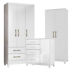 Guarda Roupa Infantil Lima com Cômoda Vênus com pés e Armário Multiuso Jade Branco Brilho Moval