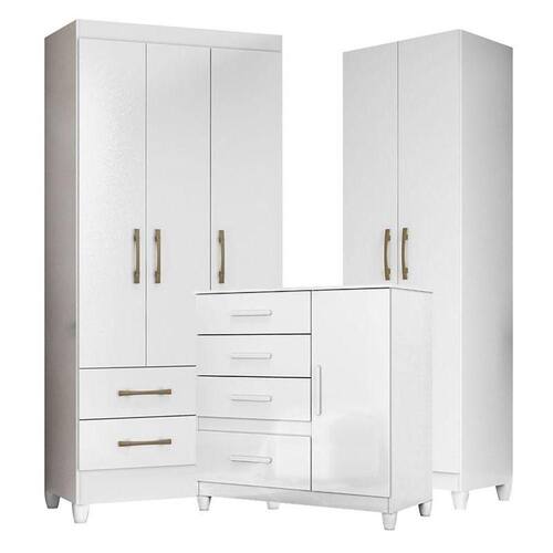 Guarda Roupa Infantil Lima com Cômoda Vênus com pés e Armário Multiuso Jade Branco Brilho Moval
