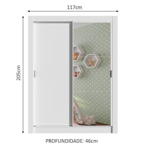 Medidas totais do guarda-roupa: 205 cm de altura x 117 cm de largura x 46 cm de profundidade.