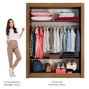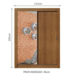 Medidas totais do guarda-roupa: 205 cm de altura x 117 cm de largura x 46 cm de profundidade.